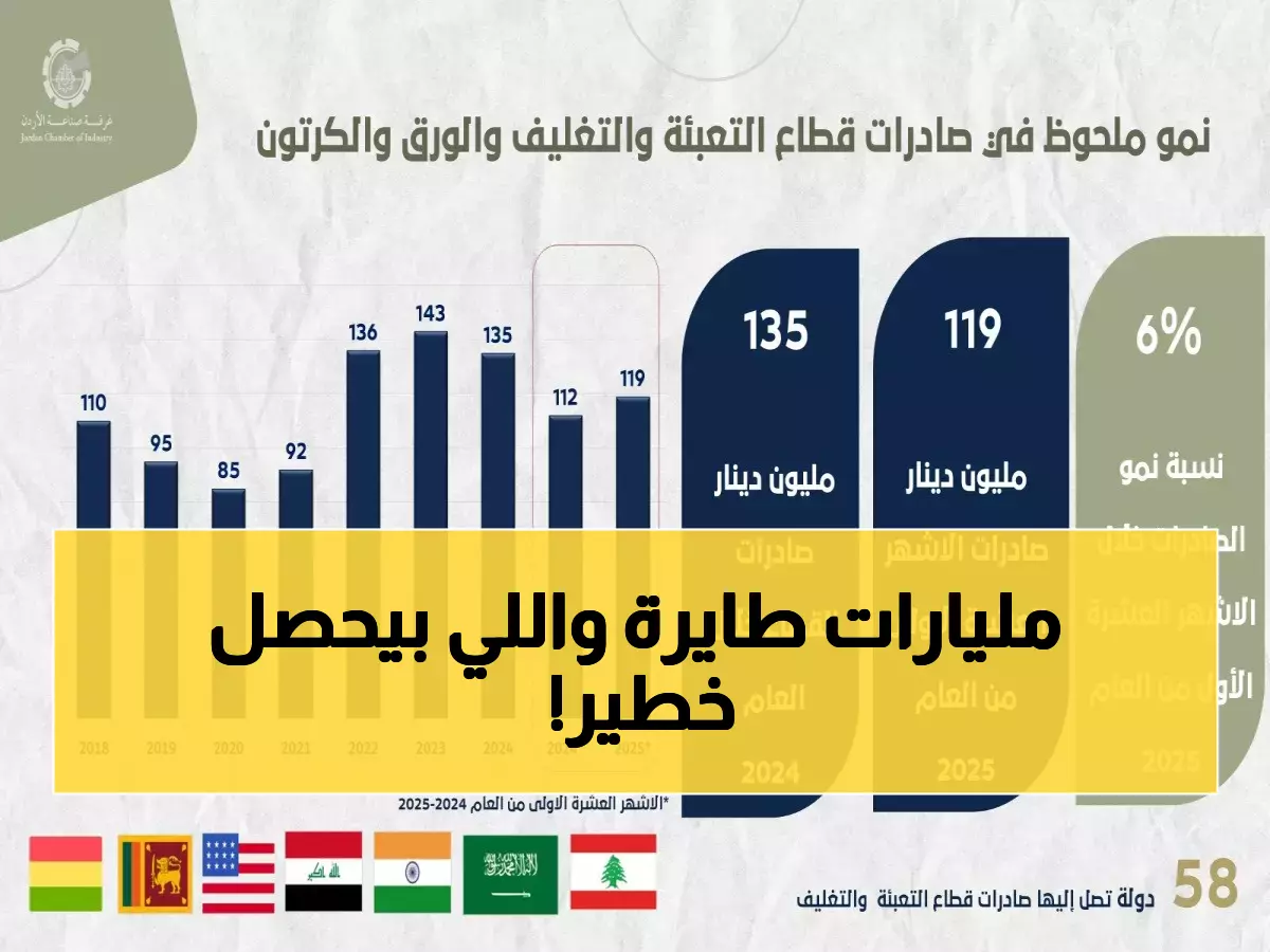 مليار دينار كامل - رقم صادم يكشفه تقرير حديث لغرفة صناعة الأردن عن إمبراطورية اقتصادية خفية تهيمن على حياتنا اليومية دون أن ندري. قطاع صناعات التعبئة والتغليف والورق والكرتون حقق هذا الإنجاز المذهل في مبيعاته للسوق المحلية وحدها، بينما تتبخر أمام أنظارنا 81 مليون دولار سنوياً من الفرص التصديرية الذهبية دون استغلال!
