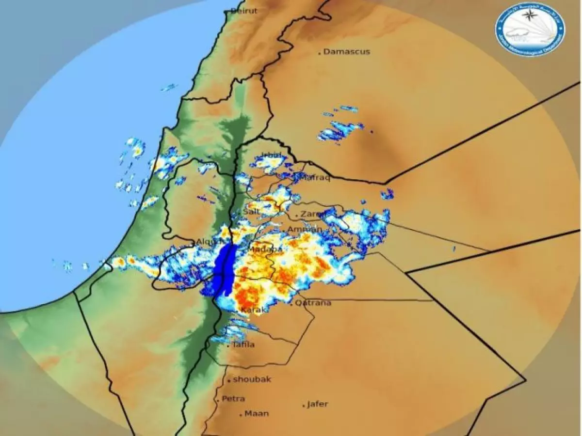 وتشير بيانات رادار الطقس الرسمية إلى أن جداراً مائياً هائلاً يزحف حالياً نحو الجنوب الغربي، حيث تتعرض محافظة الكرك لأمطار غزيرة، بينما تشهد أجزاء واسعة من محافظة العاصمة ومأدبا هطولات تتراوح شدتها بين المتوسطة والغزيرة.